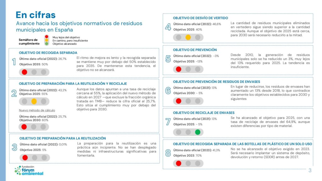 De los ocho compromisos legales en materia de residuos, España va retrasada significativamente en seis: la recogida separada, el reciclaje, la preparación para la reutilización, la prevención de residuos ―incluido los objetivos específicos para envases y la recogida separada de las botellas de plástico de un solo uso―. Esto compromete el avance hacia los objetivos europeos de 2025,2030 y 2035.