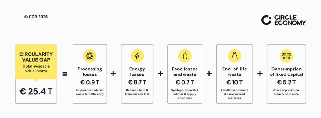 Cada any, al món es perden materials per un valor de 25,4 bilions d’euros com a conseqüència de l’economia lineal, basada en el model d’extreure, produir, consumir i llençar. Aquesta pèrdua s’explica per un ús ineficient dels recursos, com, per exemple, productes que es descarten abans d’hora i actius que no s’aprofiten prou. Tenint en compte que el Producte Interior Brut (PIB) global és de 82,6 bilions d’euros, això equival a dir que,per cada 3 euros de valor econòmic que es crea, se’n perd 1. És la primera vegada que el Circularity Gap Report 2026, elaborat per Circle Economy i Deloitte, quantifica aquesta bretxa de valor —o Value Gap.